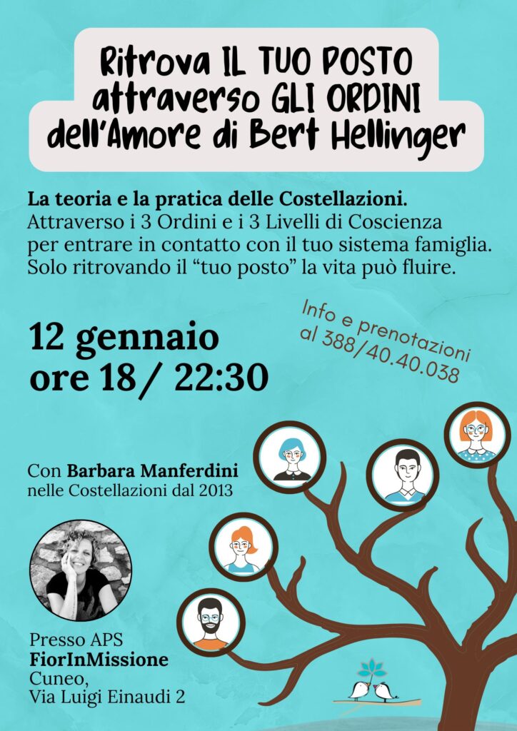 L’incontro, della durata di 4 ore, con pausa durante lo svolgimento circa a metà, si fonda sulle basi delle Costellazioni Familiari. Non verranno messe in scena Costellazioni di gruppo partendo da una richiesta specifica, ma ognuno porterà a casa un profondo lavoro interiore sulle dinamiche e gli schemi del proprio sistema famigliare. Con l’invio di questo modulo procedi all’iscrizione e sarai contattato per la definizione e il pagamento di € 55.
